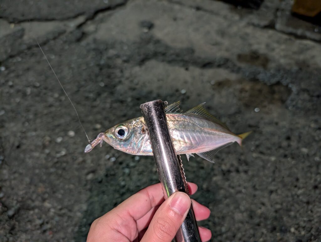 周りではサビキ釣りでアジがぽつぽつと釣れていたのでヒイカは諦めアジングに。