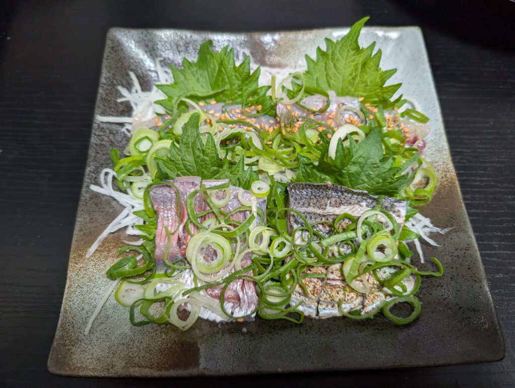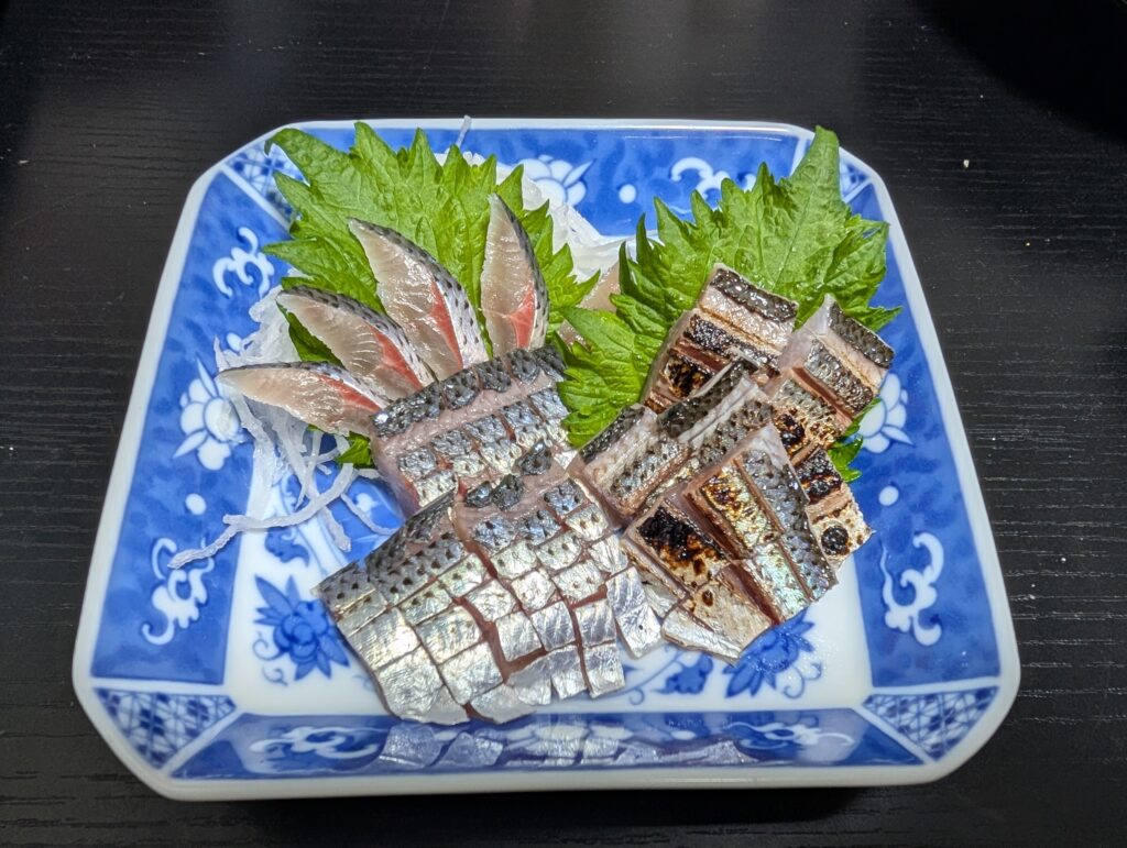 今回はアジとコノシロの刺身盛り、コノシロフライ、コノシロの酢締め、コノシロの塩焼きにして頂きました。