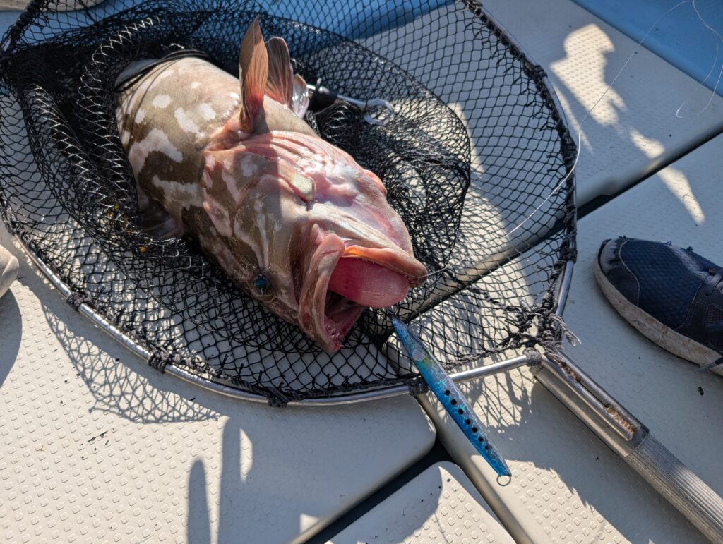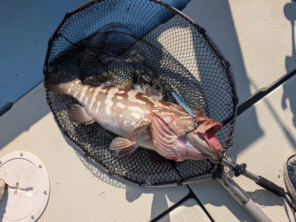 昨年の初夏に遊漁船「彩夢」でSLJをした時に小さなクエが釣れましたがリリースしてあげたので帰ってきてくれたんですね(笑)。