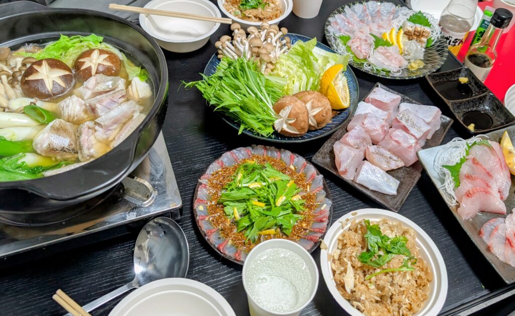 後日、クエとヒラマサは5日ほど寝かせてから友人たちと鍋や刺身でいただきました!