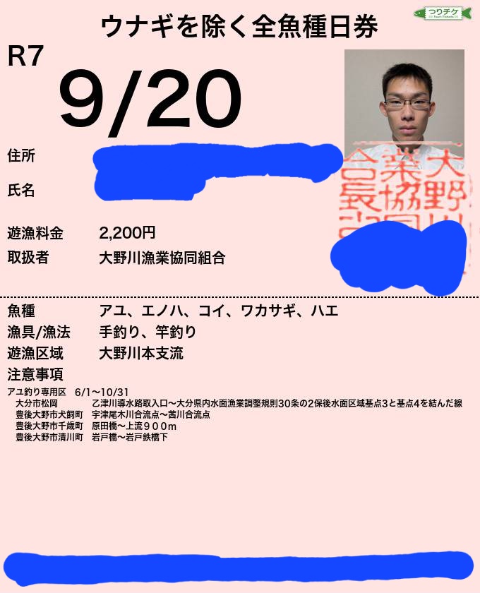 現地で買うこともできますが割高なのと、大野川水系はオンラインで買えるので便利〜