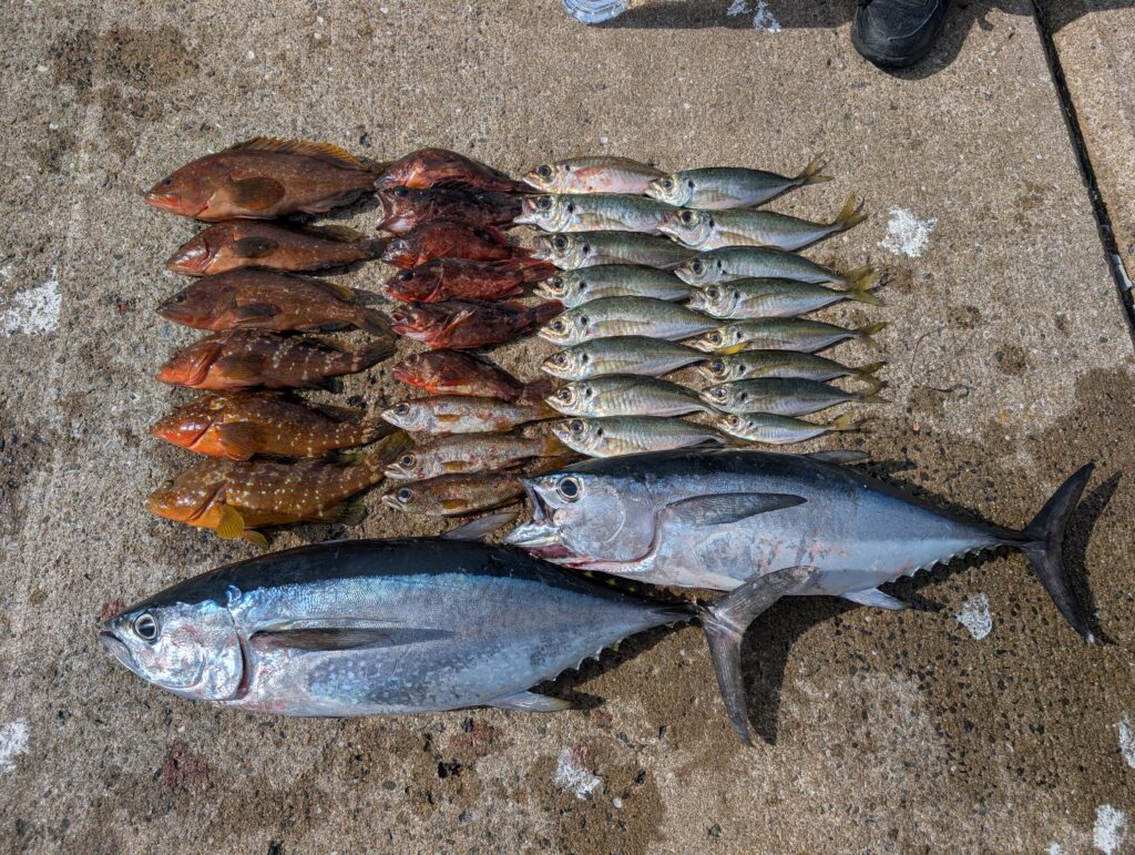 釣れた魚たちはコシナガマグロは釣った本人が、その他の魚はみんなで話し合って良い感じになるように分配しました(笑)。