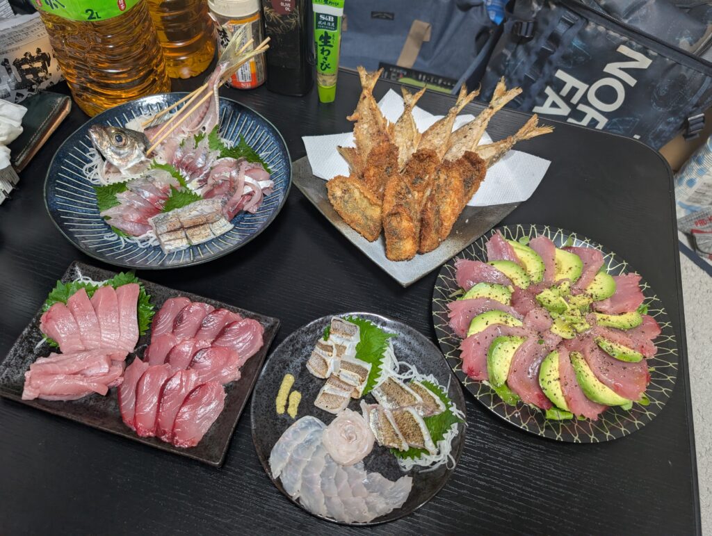 帰宅したその晩に僕と広島在住の友人とで、コシナガマグロ、キジハタ、カサゴ、ムツ、マアジを料理していただきました!