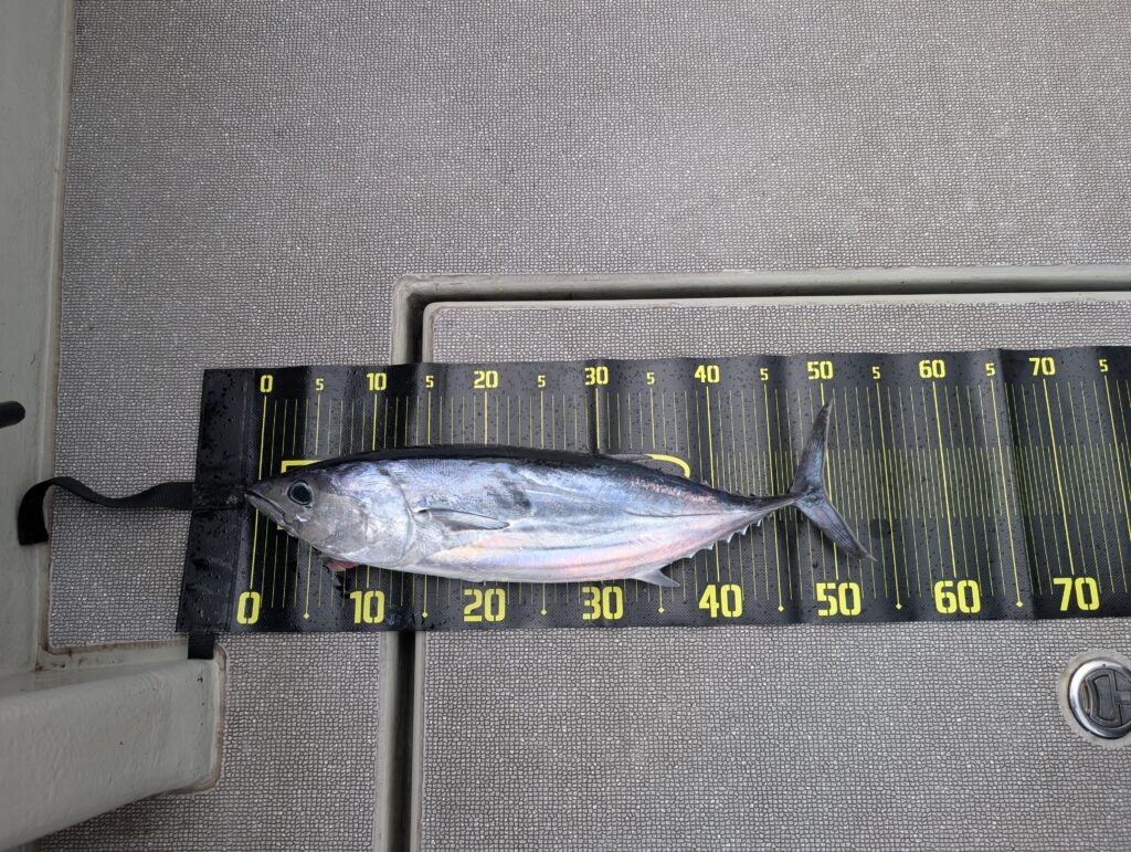 隣のお客さんがジギングでヨコワを掛けてリリースしていたのでカツオ・マグロ系がいるのかなと思い、しっかりボトムから表層までサボらずしゃくり続けていると…