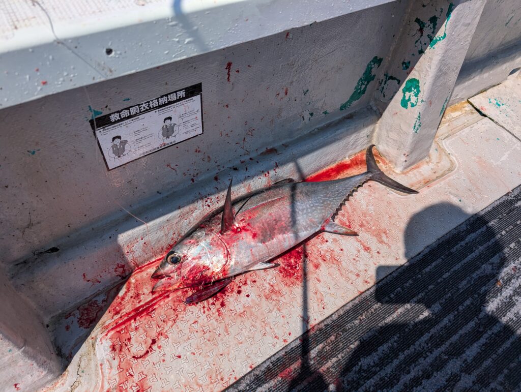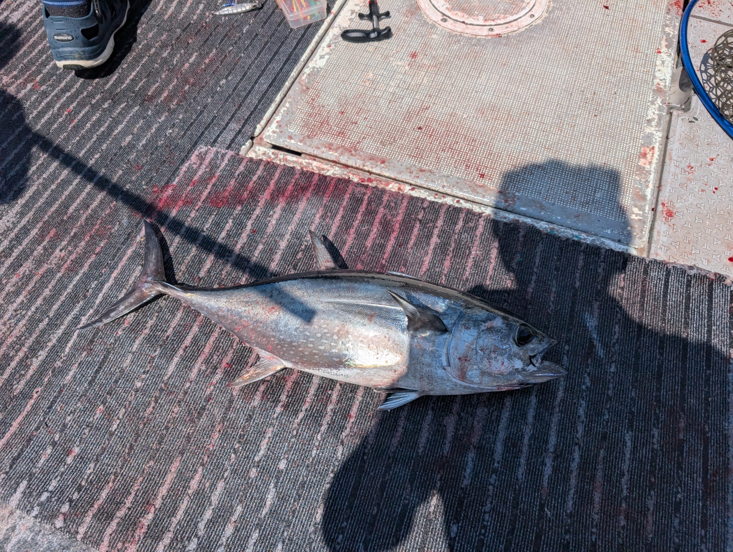 しかし、このあとカツオがヒットしたのですがタモ入れが間に合わず抜き上げたところ口が切れて逃げられてしまいました(泣)。