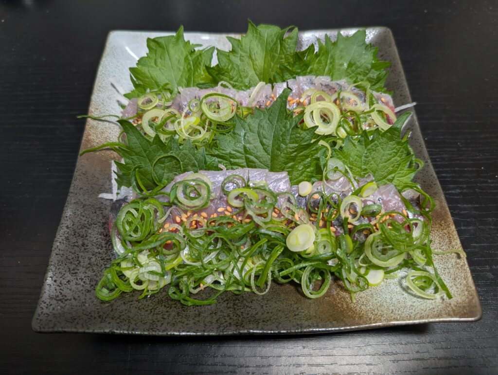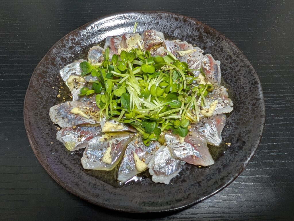 程よい酢締め加減による酸味とオリーブオイル、ペッパーが良いバランスになってくれました。小アジは酢締めをしたほうが中骨が気にならず良い気がしますね。